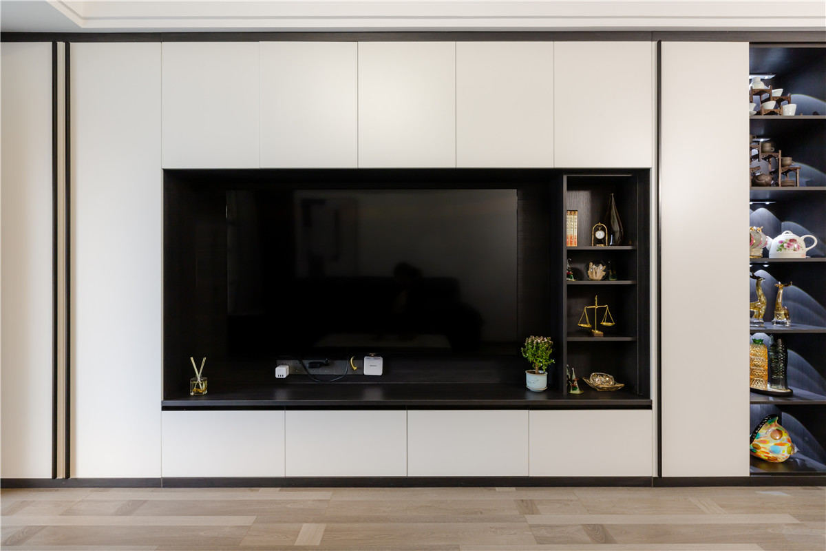為獲得充足的儲物面積,電視背景墻做的電視柜的形式。電視被內(nèi)嵌其中,裝點著一些小玩意和綠植。旁邊還有一面展示柜,用以存放一些精美的藝術(shù)品。白色柜面也做了線條的勾勒,每個區(qū)域都劃分得當(dāng)。