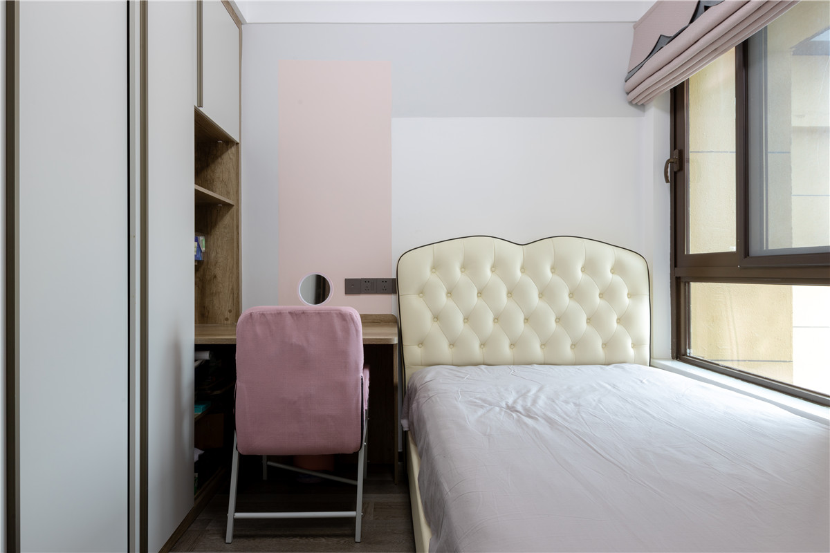 而這里是女兒房。墻面用乳膠漆做了分色,增加了室內(nèi)層次感。旁側(cè)做了定制柜體,集書桌、衣柜功能于一體,確保整個居室的功能性。讀書儲物,都不耽誤。