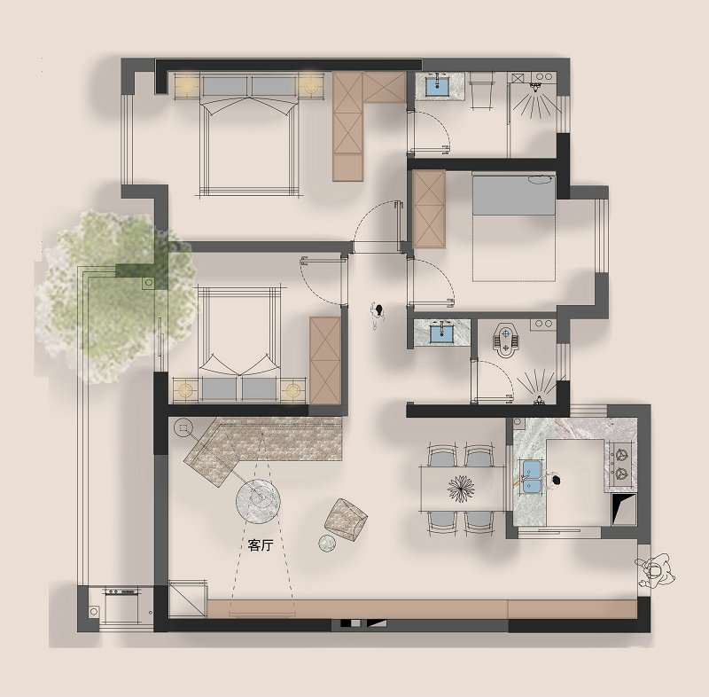 本案戶型方正,南北通透,由于背靠長陽臺,采光極其優(yōu)越。業(yè)主格外看重功能性,希望家里有著更多儲物空間。為此設(shè)計師逐步做出調(diào)整:(1)從進門口開始,打造整排鞋柜+餐邊柜+電視柜,整體長度達到8m有余;(2)廚房面積不大,將冰箱放在了外邊。同時墻壁設(shè)置開放窗口,實現(xiàn)餐廳和廚房間的互動交流;(3)陽臺和次臥做了貫通,完美呈現(xiàn)溯回動線;(4)公共衛(wèi)生間做了干濕分離,提升整體利用率。