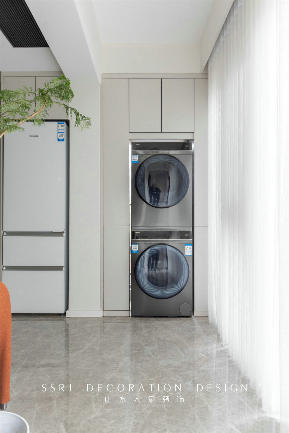 6m長的陽臺和客廳打通,整個空間得到最大化的光線,非常地透亮。同時打造高柜,將洗烘套裝包在里面,這樣不僅儲物在線,還滿足了洗衣晾曬的功能,居家實用性大幅提升。