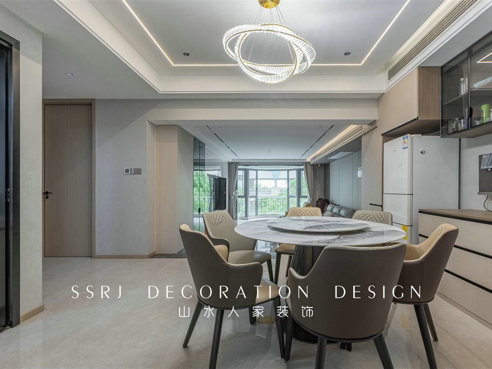 餐廳天花同樣做了回字形吊頂,周圍一圈用燈帶點綴。主燈造型精美,更好地適配周圍環(huán)境,渲染了溫馨舒適的就餐氣氛。