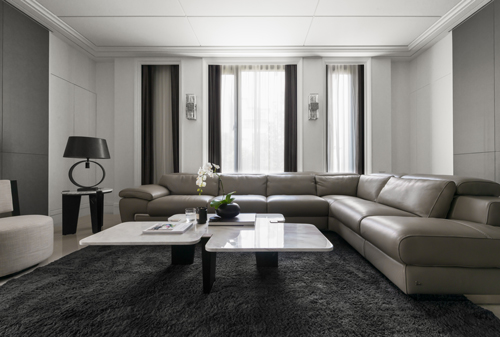 選擇的沙發(fā)擁有高背造型,側(cè)邊特殊的皮革設(shè)計,搭配輕巧極簡的底座線條,呈現(xiàn)出一種既雍容奢華又精悍俐落的沖突美感,能為空間塑造出極其鮮明的標(biāo)記。
