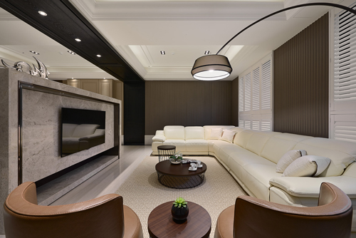 客廳裝修時,挑選到喜歡的沙發(fā),靠墻卻擺不下該怎么辦呢?此案依照客廳尺寸選擇,以3人座的尺寸,放一張?zhí)?,放兩張卻會超過背墻尺寸。經(jīng)多次討論后選擇運用兩個模組,面對電視墻以V字型擺放,讓客廳產(chǎn)生集中感,視覺效果更有層次。
